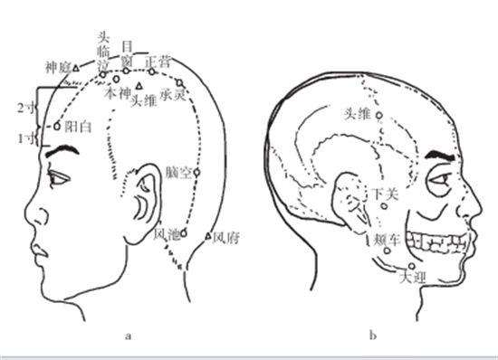 1.归经 足少阳胆经2.定位 在头部,目正视,瞳孔直上入前发际5 寸,神庭与头维连线的中点(图3⁃1a)3.功效与主治功效:散风止痛,理气散结主治:头痛,耳鸣, 耳聋,目痛,流泪等目疾,支气管炎,扁桃体炎,中风后遗症4.蜂针应用说明 ①配风池、太阳、百会,治头痛,需要注意的是太阳穴距眼区太近,蜂针时慎用,不可直刺②配颊车、下关、合谷,治齿痛,颊车、下关等穴离五官较近,可行散刺法③配天牖、 天容、天突,治瘰疬