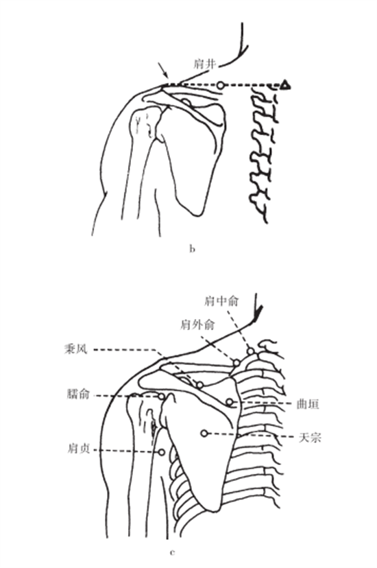 2.定位 在肩部,当腋后纹头直上,肩胛冈下缘凹陷中(图3⁃3c)。