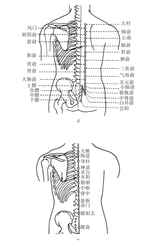 2.定位 取俯伏位,在背部,当后正中线上,第9胸椎棘突下凹陷中(图3⁃3e)。