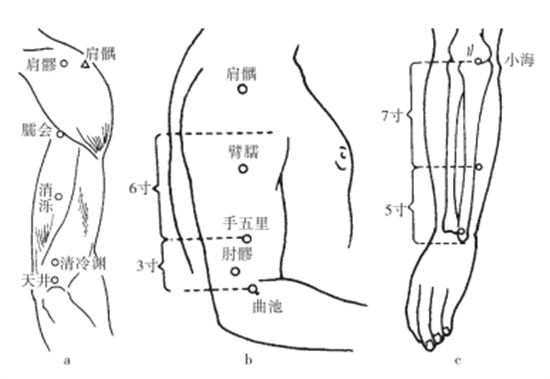 4.蜂针应用说明①该穴治病广泛,配肩俞、肩贞治肩周炎;②配肘髎、外关治肘臂挛痛。